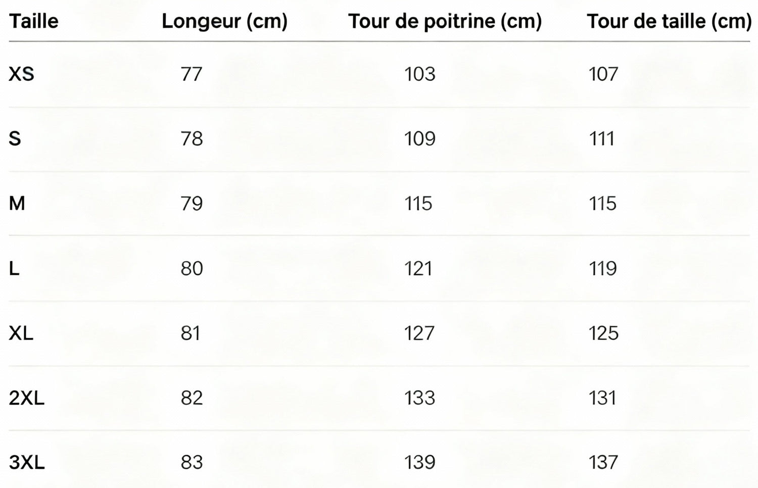 Consultez le guide des tailles ci-dessous pour trouver la bonne taille au niveau de la taille et des hanches. Toutes les mesures sont exprimées en centimètres.